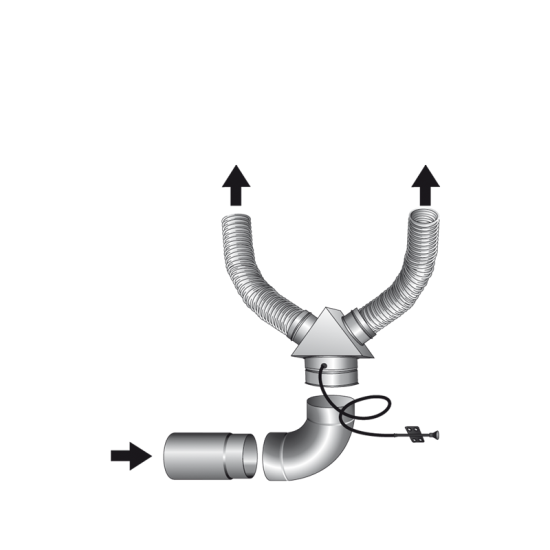 Стоимость указана только за тройник. Дополнительная картинка показывает принцип подключения. То есть от топки идут два воздуховода диметром 80 мм и подключаются к тройнику. Третий выход у тройника диаметром 100 мм, он подключается к подводу внешнего воздуха. Стрелками на схеме подключения показывается направление воздуха от притока воздуха в камин.